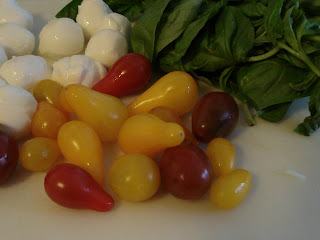 The Oscar show started and we ready for our next course of our winter version of Caprese Salad. Our previous house had the perfect southern exposure for a garden and growing our own tomatoes which we miss so much in this house. We have a great backyard now but it's far too shady for tomatoes. But when we used to grow our own and our own basil, luckily we still grow basil it likes a little shady, caprese salad was pretty much daily on our menu. There is nothing better than summer tomatoes with basil. But it's winter obviously so in the winter we improvise. Trader Joe's has these cute little grape tomatoes that we picked up and then that of course prompted us to also pick up some fresh basil and their small fresh mozzarella balls.